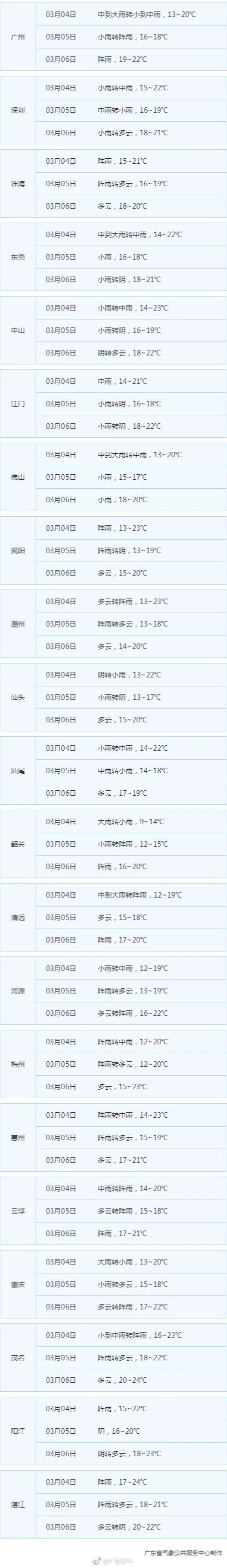 4日,韶关和清远的南部、河源北部、珠三角大部市县、粤西市县有中到大雨,局部暴雨,其余市县阴天有小到中雨。