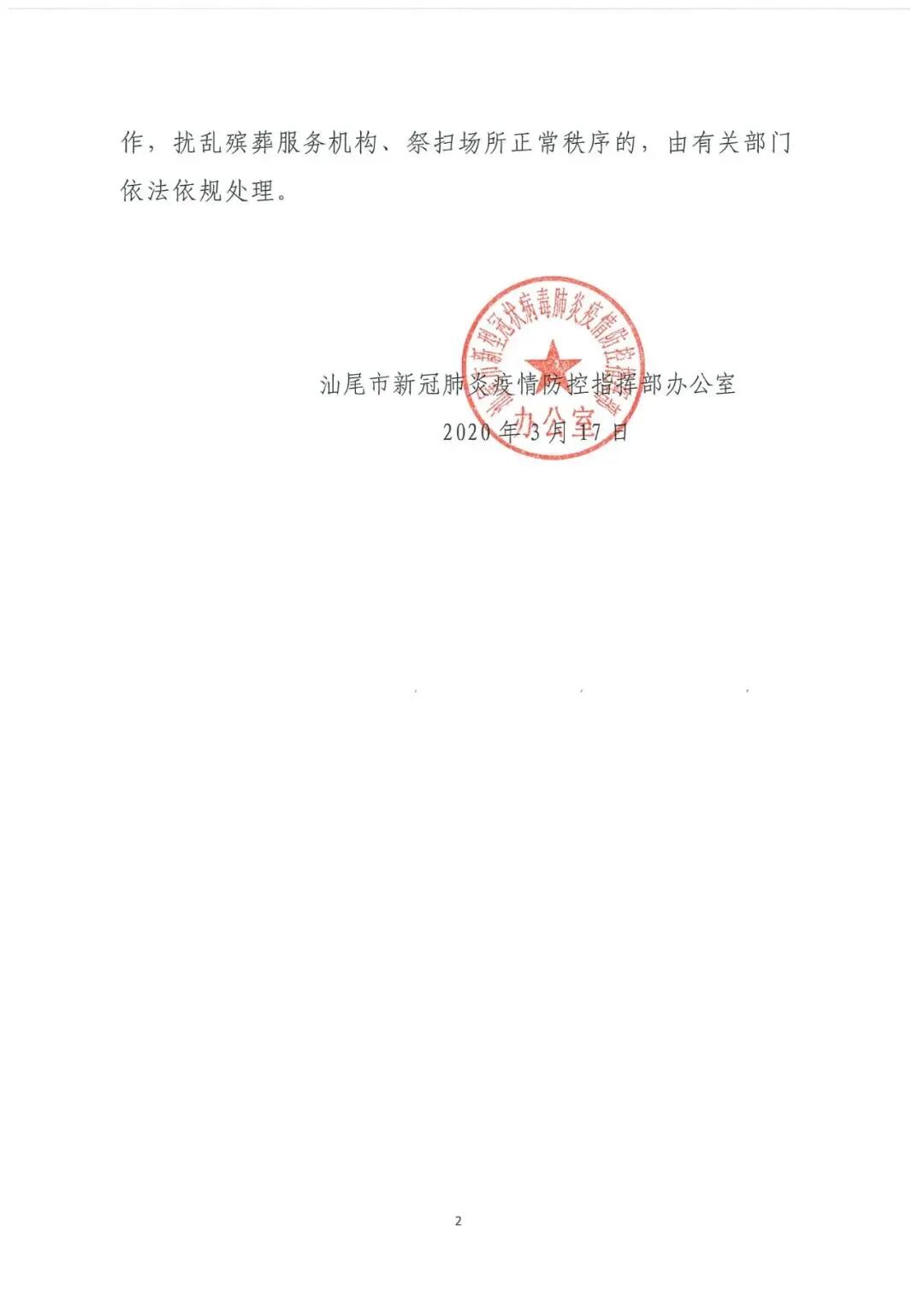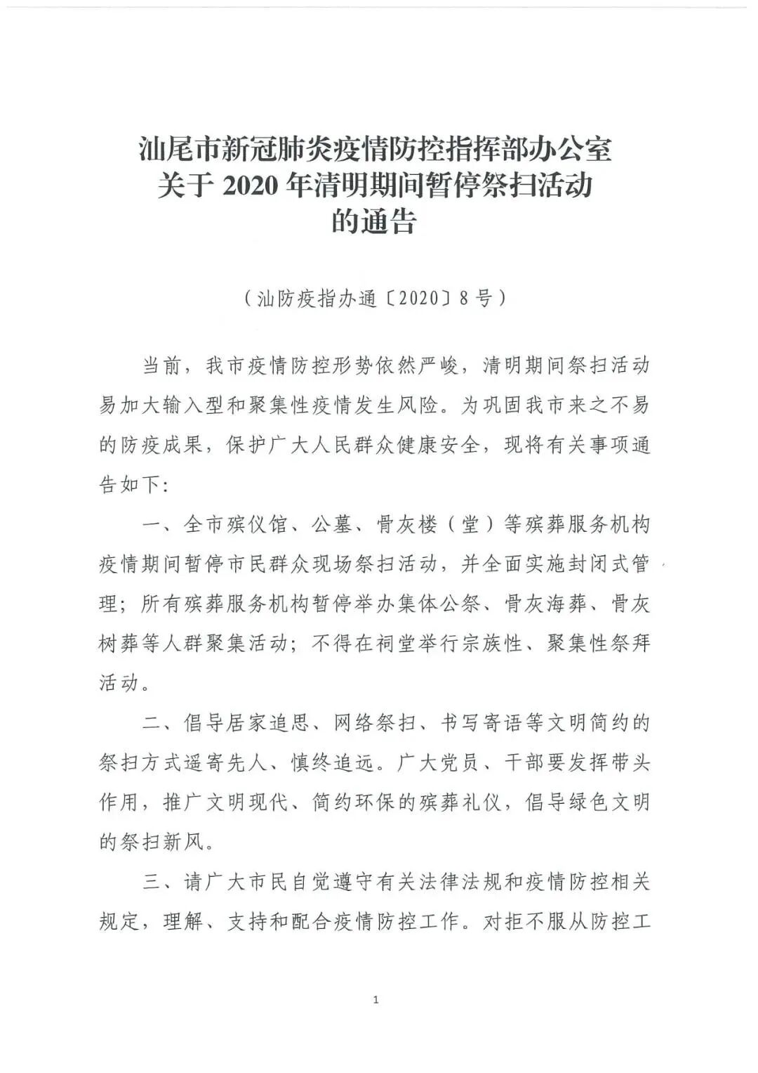 一、全市殡仪馆、公墓、骨灰楼(堂)等殡葬服务机构疫情期间暂停市民群众现场祭扫活动,并全面实施封闭式管理;所有殡葬服务机构暂停举办集体公祭、骨灰海葬、骨灰树葬等人群聚集活动;不得在祠堂举行宗族性、聚集性祭拜活动。