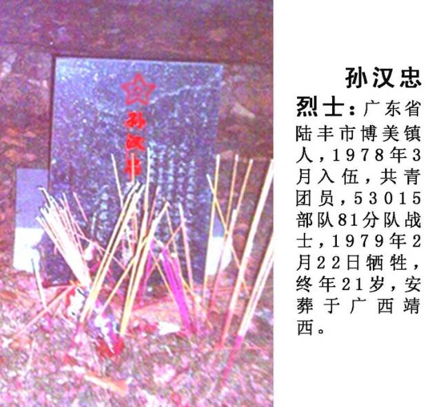 遗憾的是,目前搜集到的烈士资料尚不够完整,尤其是英烈们的立功受奖等情况多有遗漏,更为遗憾的是竟然搜集不到孙汉忠烈士的照片。但我相信这并不会因此而影响到他们的一世英名。(资料提供:李辉龙)