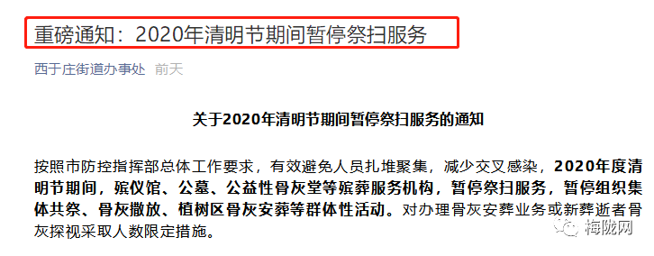 按照市防控指挥部总体工作要求,有效避免人员扎堆聚集,减少交叉感染,2020年度清明节期间,殡仪馆、公墓、公益性骨灰堂等殡葬服务机构,暂停祭扫服务,暂停组织集体共祭、骨灰撒放、植树区骨灰安葬等群体性活动。对办理骨灰安葬业务或新葬逝者骨灰探视采取人数限定措施。