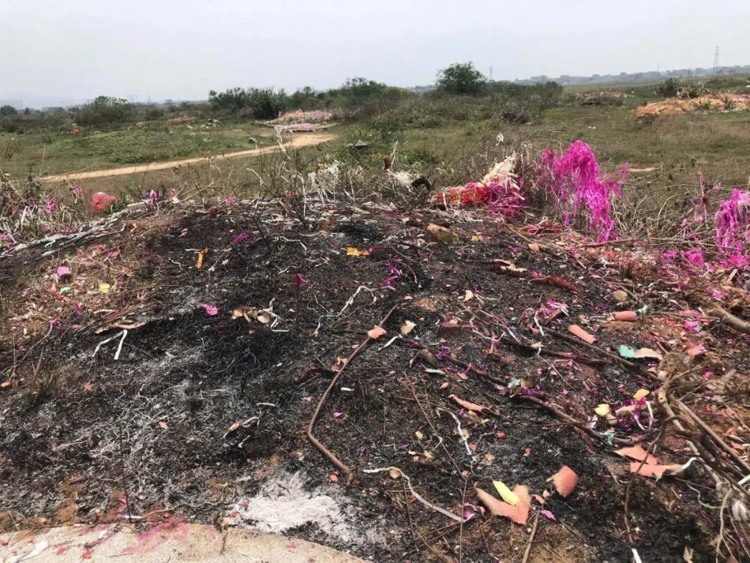 接警后,潭西派出所立即组织警力前往现场处置。经查,嫌疑人林某汉(男,74岁,陆丰潭西人)于当天12时许带领其子孙等人在324国道上埔村路段旁进行拜祭活动,并在坟墓上燃烧香烛、纸钱和燃放鞭炮。