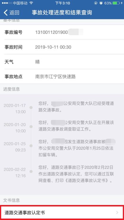其中,事故处理进度包括案件受理、扣留扣押、调查取证、检验鉴定、损害赔偿调解等内容;事故处理结果包括道路交通事故认定书(证明)、复核结论等内容。