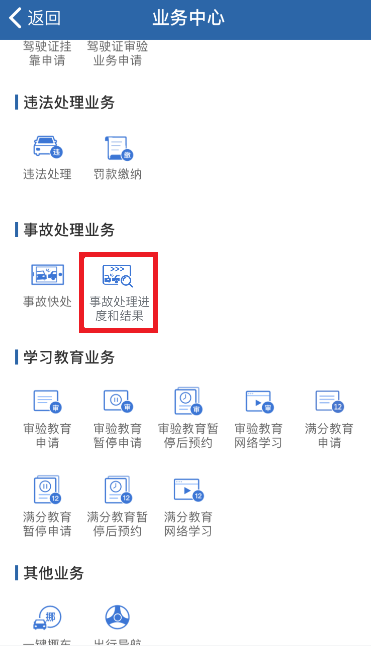 用户也可以登录“交管12123”手机APP,点击【业务中心】【事故处理进度和结果】,输入查询凭证提供的事故编号和查询码,验证成功后,用户点击【查询】按钮查看事故处理进度和结果信息。
