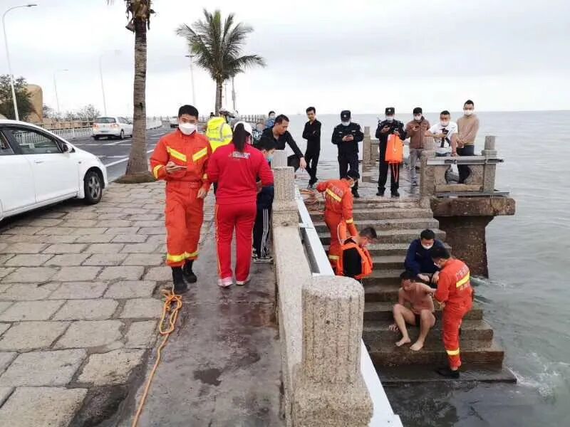 几名消防员和附近街坊从海里