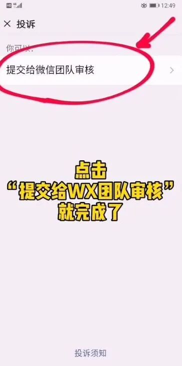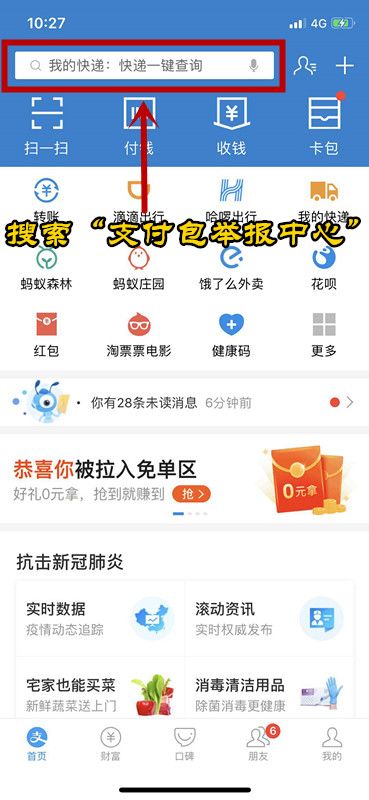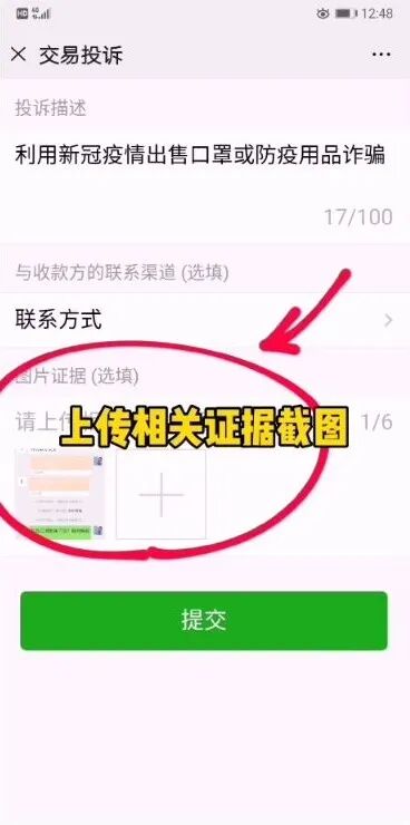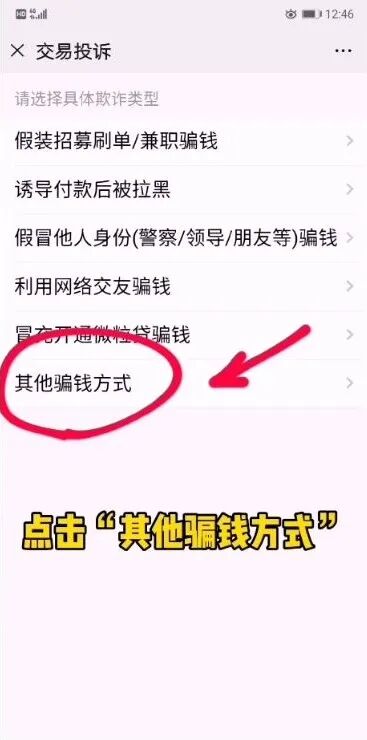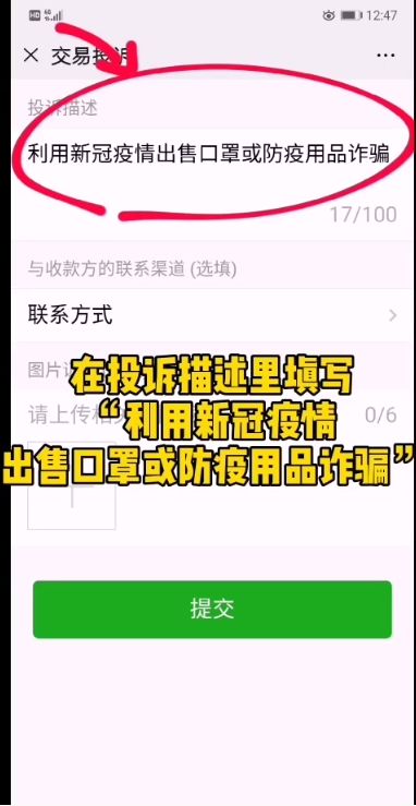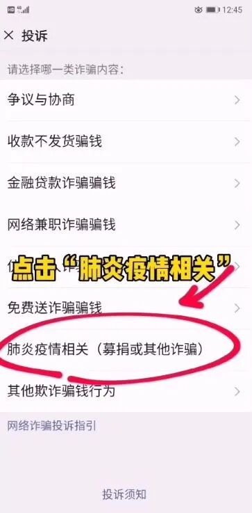 ②点击投诉→存在欺诈骗钱行为→肺炎疫情相关→提交投诉