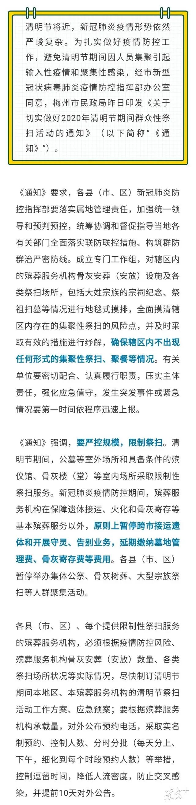 日前,广东省民政厅印发通知,要求各地按照“突出重点、统筹兼顾,分类指导、分区施策”的工作要求,对清明节祭扫期间殡葬服务机构疫情防控形势进行科学研判,精准实施分区分级差异化防控策略。根据要求,广东暂停举办集体公祭、骨灰海葬、骨灰树葬等人群聚集活动。各地级以上市新冠肺炎防控指挥部要尽快研究决定清明节期间本地区殡葬服务机构暂停或者限制祭扫服务,并对外公告。疫情防控风险较高的,暂停祭扫服务;具备条件且防控措施落实到位的,可提供限制性祭扫服务。据统计,截至3月15日17时,深圳、汕头、中山、肇庆等地发文明确,全市暂停祭扫服务,倡导通过家庭追思、网络祭扫、书写寄语等方式遥祭先人、慎终追远。此外,韶关市殡仪馆暂停2020年清明祭祀活动。3月13日,深圳市民政局发布通知,明确全市所有公墓、骨灰堂等殡葬服务机构,即日起暂停市民群众现场祭扫活动。3月30日起,开通网上祭奠通道,市民可通过“i深圳”市民政局部门主页的“网上祭奠”模块在互联网上进行祭奠。据汕头市民政局官网,汕头全市所有公墓、骨灰楼堂等殡葬服务机构暂停市民群众现场祭扫活动,祭扫场所(区域)实行封闭式管理,并提倡以下替代方式:公墓机构免费代祭,为每个墓穴敬献菊花;有条件的殡仪馆、骨灰楼堂管理处可提供免费民俗公祭,群众不参与公祭现场;有条件的殡葬服务机构提供免费网络线上祭扫;支持群众延后祭扫,或调为重阳、冬至祭扫。据中山发布,中山全市所有殡葬祭扫场所(区域)、公共场所暂停祭扫活动。殡葬服务机构办理骨灰安葬、寄存业务,采取预约并限定人数措施。据肇庆发布,肇庆全市殡仪馆、公墓、骨灰楼(堂)等殡葬服务机构暂停市民群众现场祭扫活动,并全面实施封闭式管理;所有殡葬祭扫场所(区域)、公共场所暂停祭扫活动;所有殡葬服务机构暂停举办集体公祭、骨灰海葬、骨灰树葬等人群聚集活动。此外,梅州等地发布通知,可提供限制性祭扫服务。茂名市殡仪馆提供限制性祭扫服务,祭扫实行电话实名制预约。梅州提出,清明节期间,公墓等室外场所和具备条件的殡仪馆、骨灰楼(堂)等室内场所采取限制性祭扫服务。各县(市、区)、每个提供限制性祭扫服务的殡葬服务机构,要根据殡葬服务机构承载量,对外公布预约电话,采取实名制预约、控制人数、分时分批等举措,控制逗留时间,降低人流密度,防止交叉感染,并提前10天对外公告。![]()