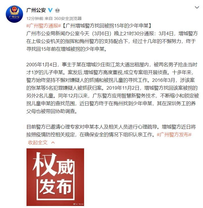 广州市公安局新闻办公室3月6日晚上21时30分通报:3月4日,增城警方在上级公安机关的指挥和梅州警方的支持配合下,经过十几年的不懈努力,终于寻找回15年前在增城被拐的少年申某。