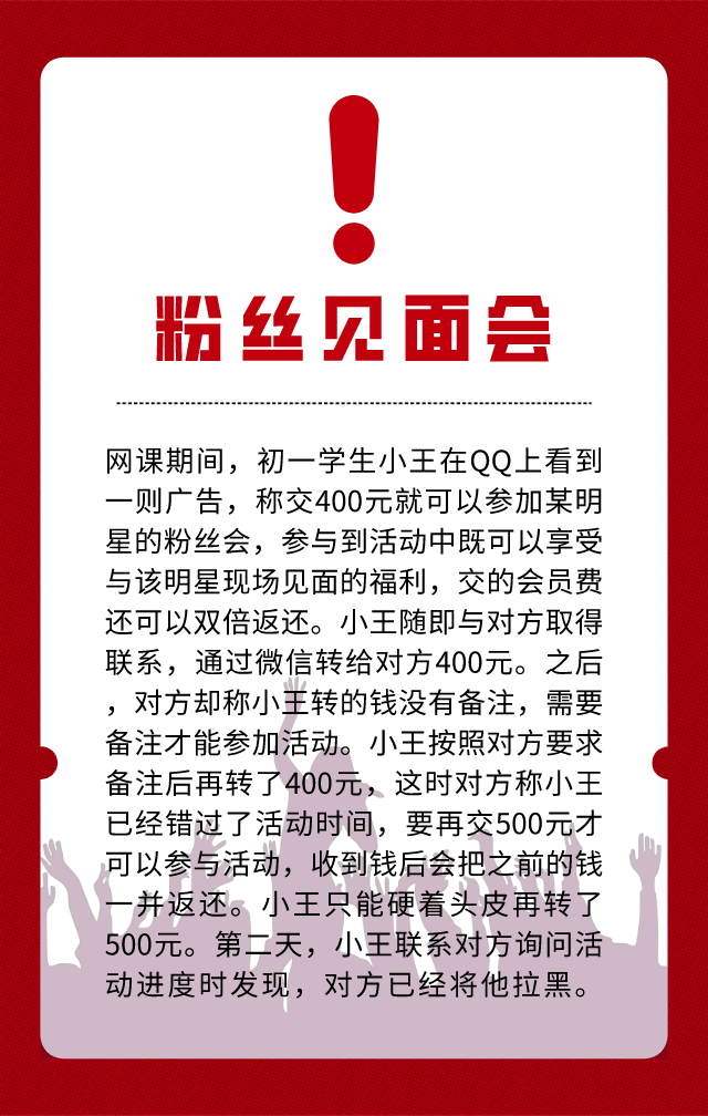 未成年人在父母的保护下,往往对金钱、骗局没有概念。然而家长们的钱并非大风刮来的,支持孩子上网课的同时,别忘了给孩子们传授金钱观念和网络安全防范意识。
