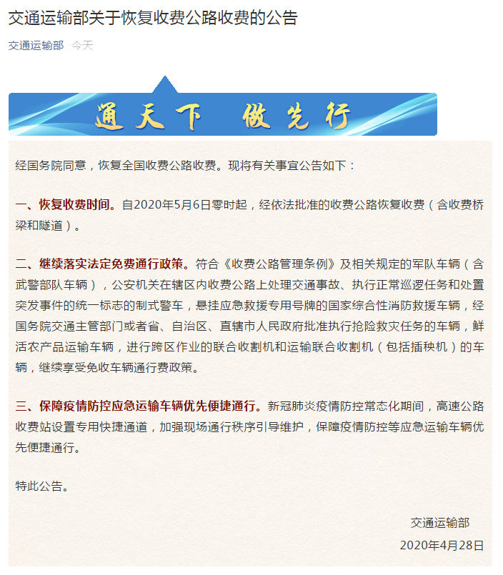 恢复全国收费公路收费的时间定了!
