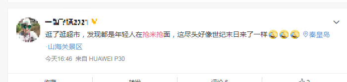 定位在秦皇岛的网友也表示超市有人在“抢米抢面”