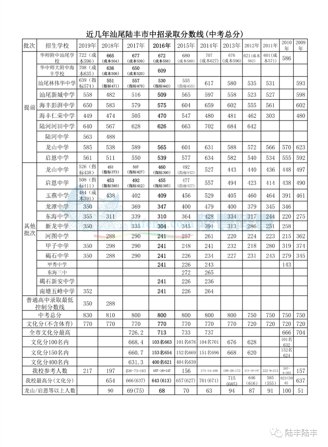 近几年汕尾陆丰市中招录取分数线(中考总分)