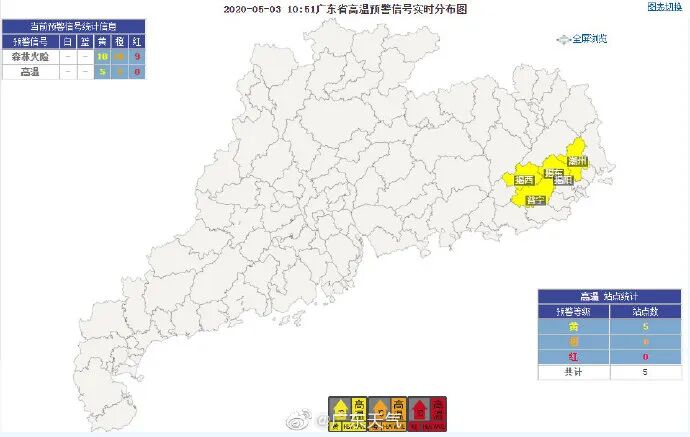 截至5月3日10时51分,潮州、揭阳、揭东、揭西、普宁已挂高温黄色预警。不过这不是今年第一个高温预警信号,早在4月20号,徐闻就已经挂过。![]()