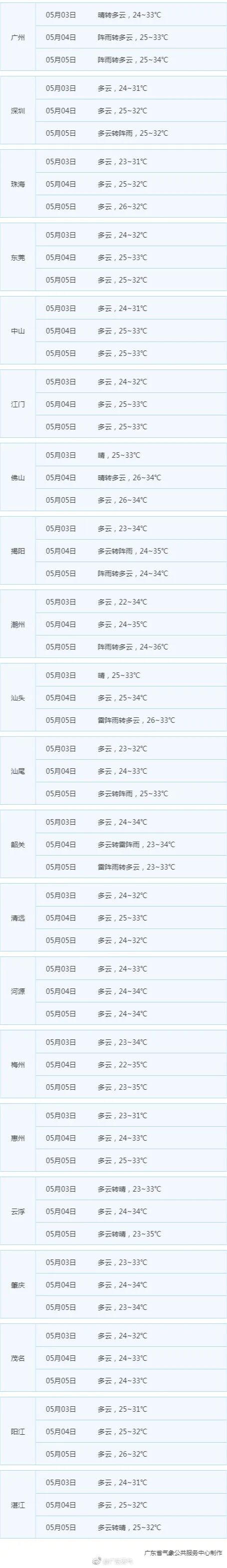 据广东天气预测,未来副高将逐渐控制我省,“高温闷雷雨”或成常态。5月3日—4日,广东大部晴间多云天气为主,各地气温较高,大部分市县最高气温介于31~34℃,部分市县可达35~36℃,湿度加大,体感闷热;5月5日—6日,受偏南气流影响,粤北和东南部沿海多云间晴为主有雷阵雨局部大雨,其余市县多云间晴为主有分散(雷)阵雨,各地气温仍然较高。需注意森林防火和家居用火安全,户外活动需注意防御局地强对流。![]()