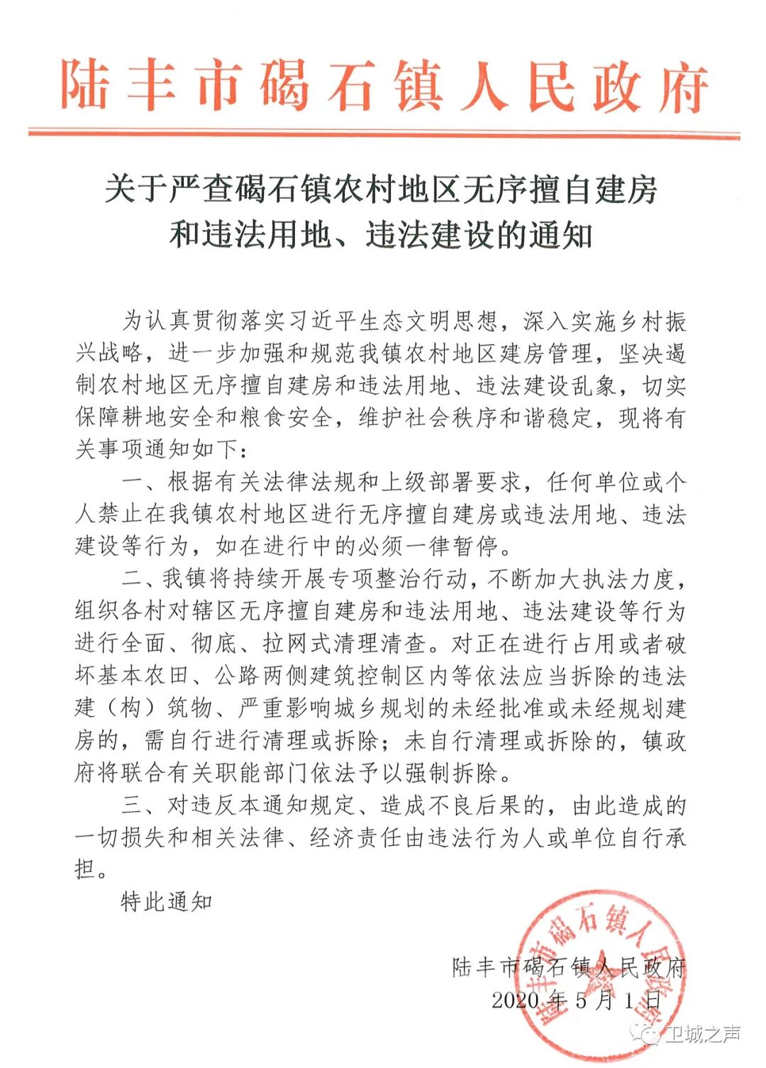 关于严查碣石镇农村地区无序擅自建房和违法用地、违法建设的通知