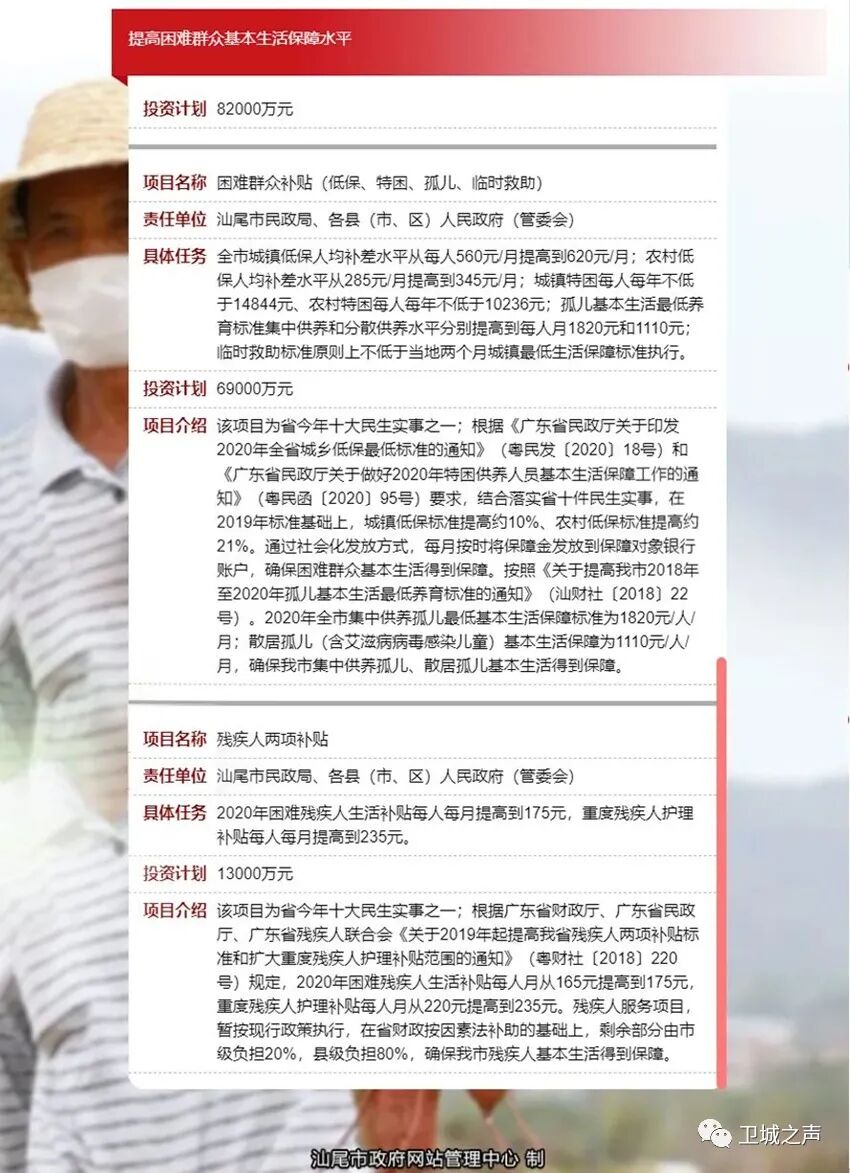 汕尾市全市城镇低保人均补差水平从每人560元/月提高到620元/月;农村低保人均补差水平从285元/月提高到345元/月;城镇特困每人每年不低于14844元、农村特困每人每年不低于10236元;孤儿基本生活最低养育标准集中供养和分散供养水平分别提高到每人月1820元和1110元;临时救助标准原则上不低于当地两个月城镇最低生活保障标准执行。2020年困难残疾人生活补贴每人每月提高到175元,重度残疾人护理补贴每人每月提高到235元。