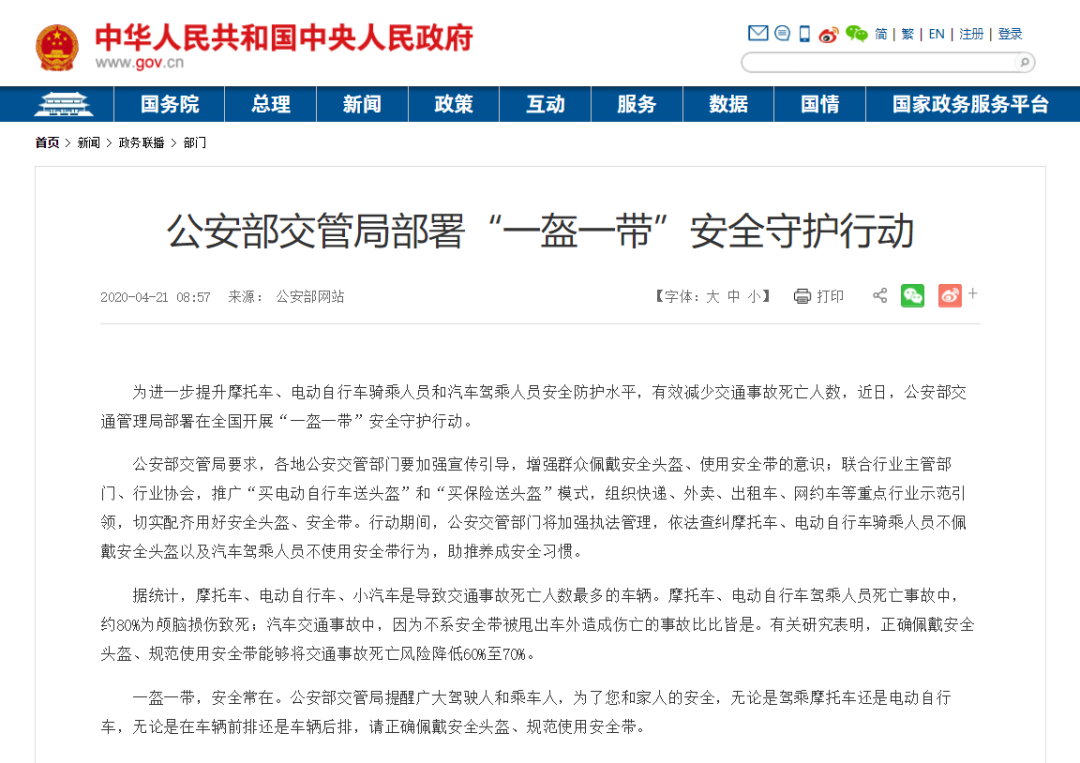 2020年4月21日,公安部通知,自2020年6月1日起,将在全国开展“一盔一带” 安全守护行动!行动期间,公安交管部门将加强执法管理,依法查纠摩托车、电动自行车骑乘人员不佩戴安全头盔以及汽车驾乘人员不使用安全带行为。