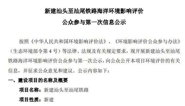 4月30日,广东广汕铁路有限责任公司发布新建汕头至汕尾铁路海洋环境影响评价公众参与第一次信息公示,向公众公开本项目环境评价的有关信息,并征求公众意见和建议。