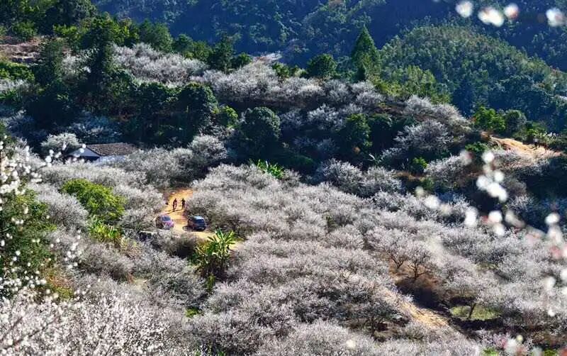 上万亩梅花竞相开放,清幽飘香,随着丘陵起伏,放眼望去,犹如北国雪乡。