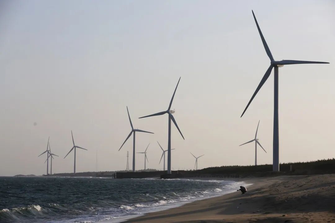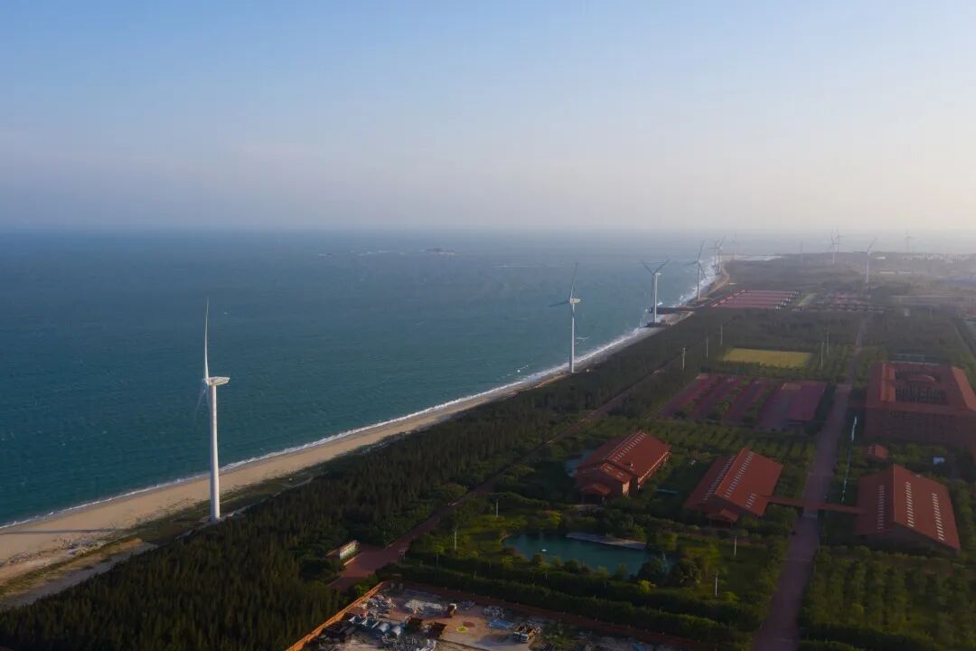 葱郁的园林环绕,一排高大的白色风车,迎着海风徐徐转动。