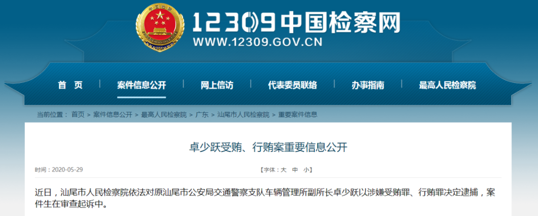 近日,汕尾市人民检察院依法对原汕尾市公安局交通警察支队车辆管理所副所长卓少跃以涉嫌受贿罪、行贿罪决定逮捕,案件生在审查起诉中。