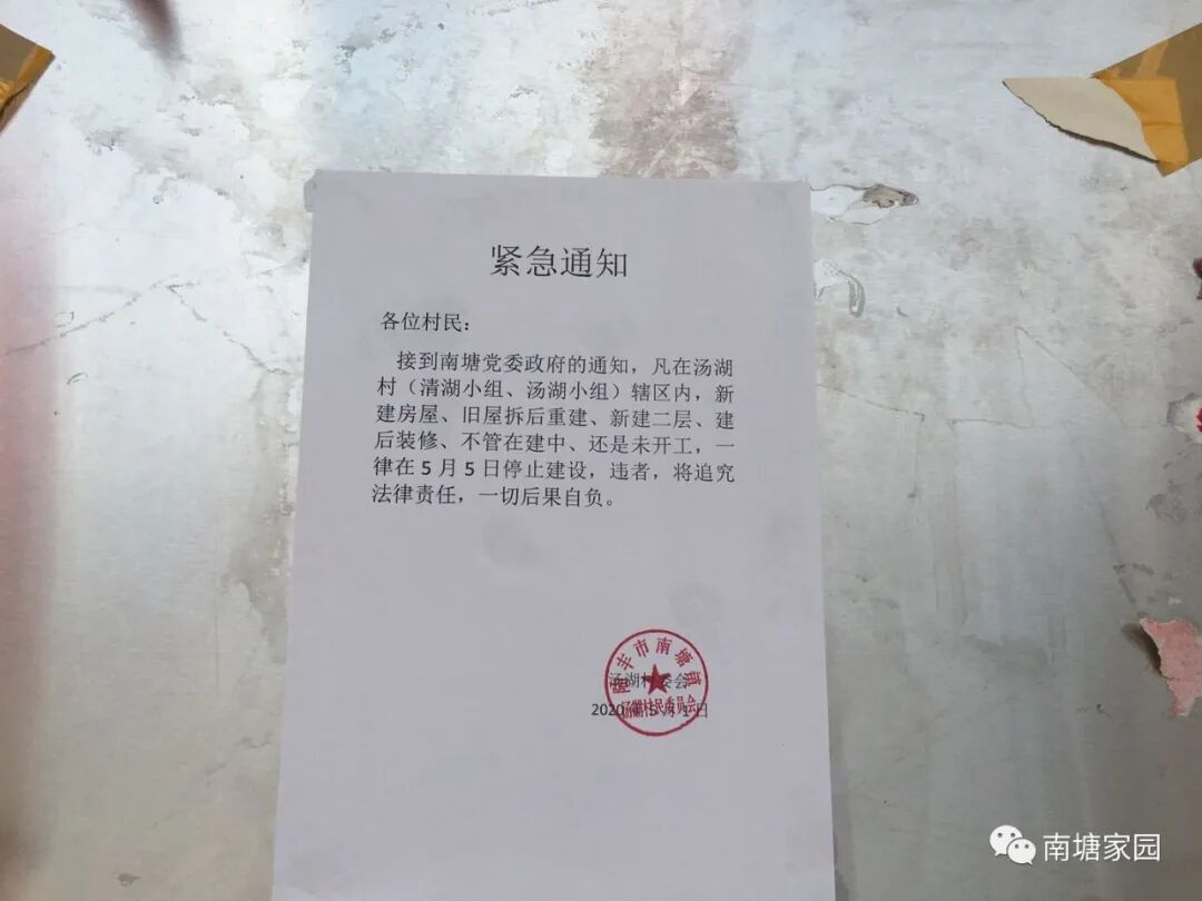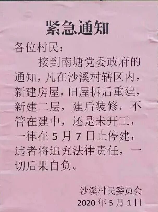 接到南塘党委政府的通知,凡在沙溪村辖区内,新建房屋,旧屋拆后重建,新建二层,建后装修,不管在建中,还是未开工一律在5月7日止停建,违者将追究法律责任,一切后果自负。