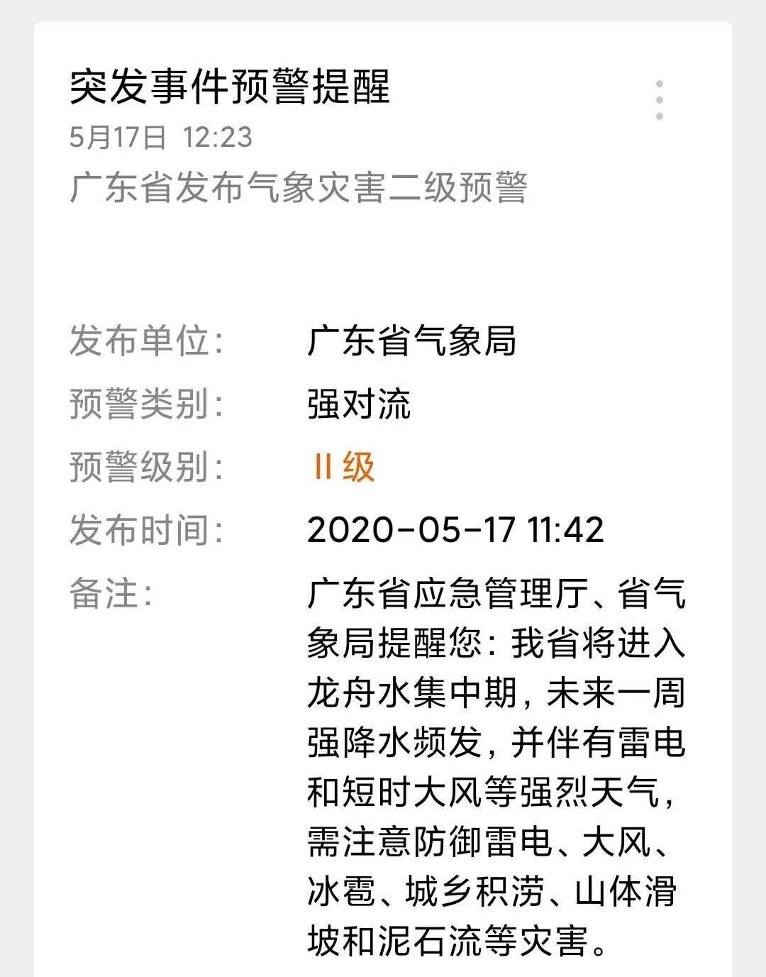 广东将进入龙舟水集中期,未来一周强降水频发,并伴有雷电和短时大风等强烈天气,需注意防御雷电、大风、冰雹、城乡积涝、山体滑坡和泥石流等灾害。