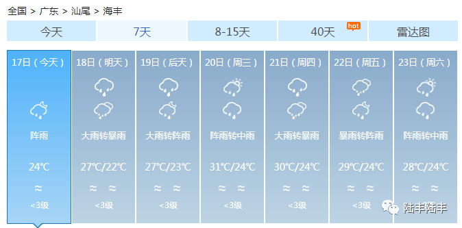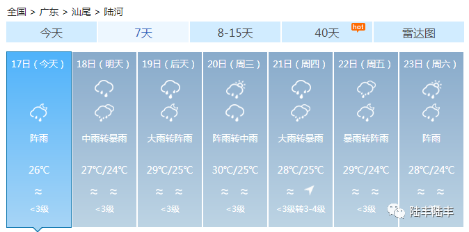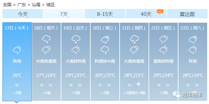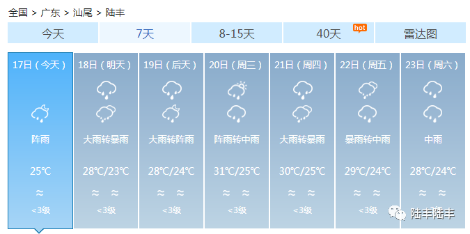 5月17日夜间到19日早晨,珠江三角洲和粤东市县有暴雨,部分地方有大暴雨,其余市县有大雨到暴雨。雷雨时部分地方伴有8级、局地10-11级短时大风。全省大部最高气温介于28~31℃。
