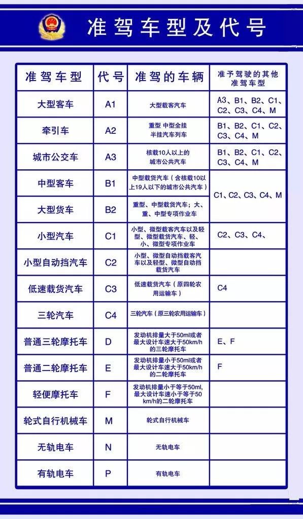 从A到P每一种代号都是对应了相应的车型,同时还有兼容的车型,字母的顺序并不代表车型的兼容顺序。准驾车型及其准予驾驶的其他准驾类型,请看下图↓↓↓