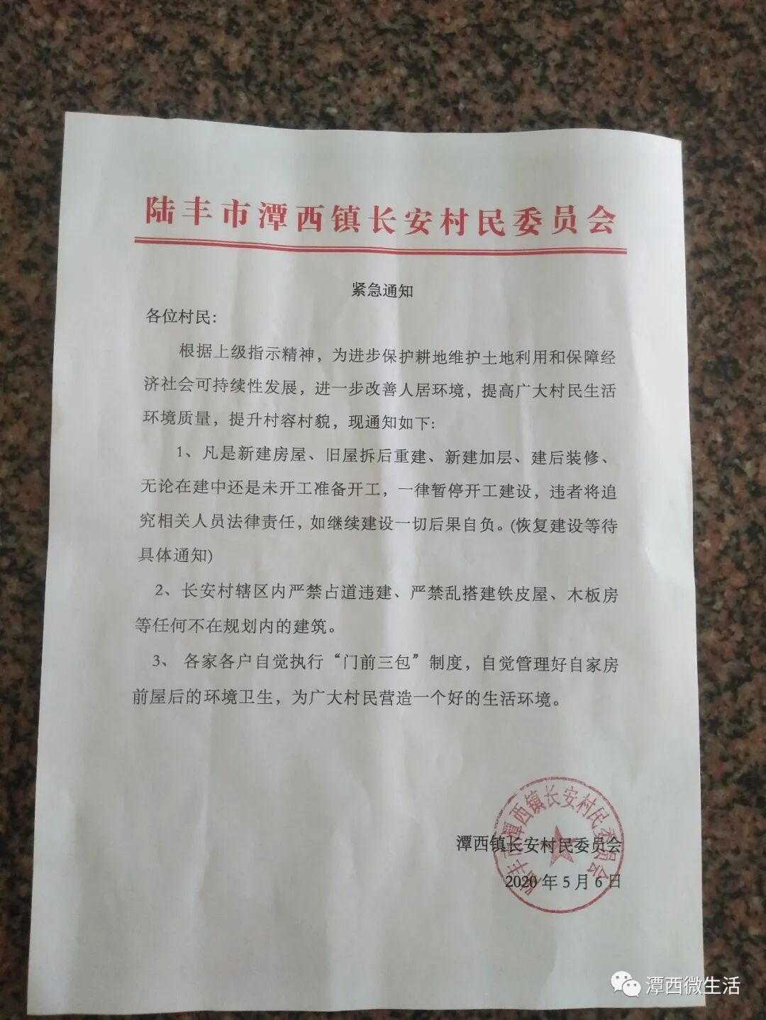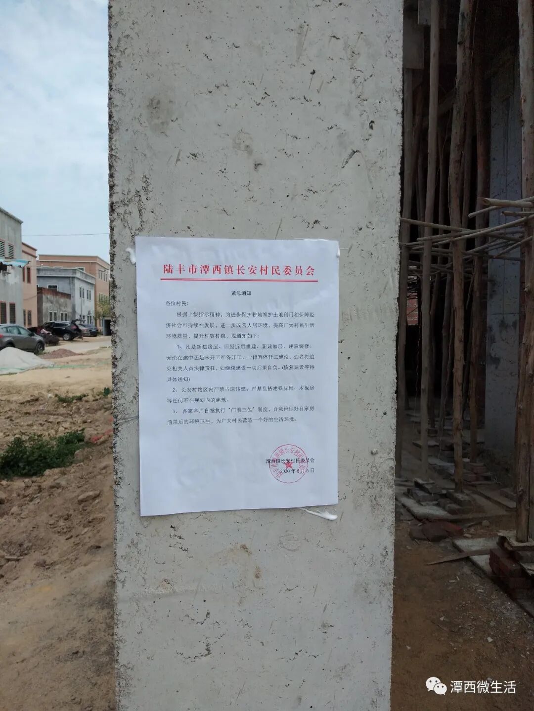 日前,潭西镇长安村民委员会根据上级指示精神,出动两委干部对辖区内新建房屋、新建加层、违建、乱建等现象进行排查,并对这些建筑贴上《紧急通知》,要求一律暂停建设。