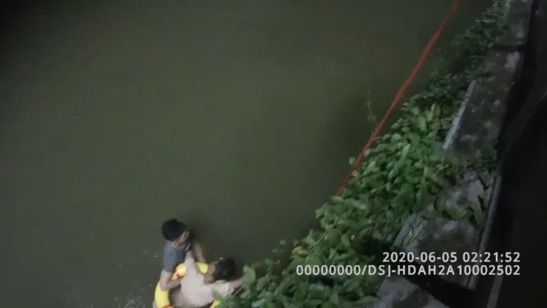 危急关头,两名民警来不及多想,纵身跳入水中,用尽全身力气,以最快的速度游向轻生男子,一把拽住男子的头部,并把救生圈套其头上,使劲往河岸边拉。可是这处路面和河岸不仅隔着栏杆,还有差不多两米的垂直距离,无法直接将轻生男子带回岸上。