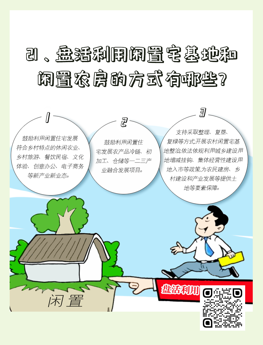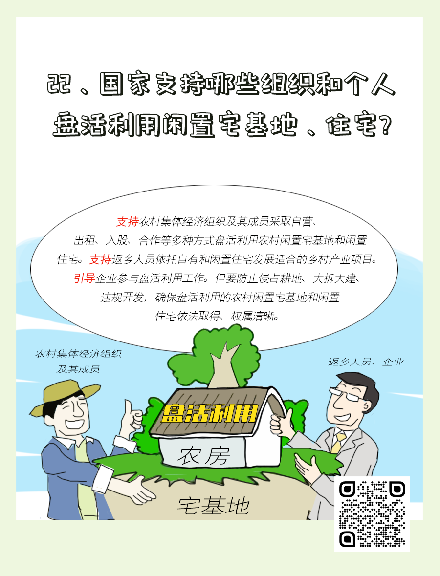 《农业农村部关于积极稳妥开展农村闲置宅基地和闲置住宅盘活利用工作的通知》规定,支持农村集体经济组织及其成员采取自营、出租、入股、合作等多种方式盘活利用农村闲置宅基地和闲置住宅。支持返乡人员依托自有和闲置住宅发展适合的乡村产业项目。引导企业参与盘活利用工作。但要防止侵占耕地、大拆大建、违规开发,确保盘活利用的农村闲置宅基地和闲置住宅依法取得、权属清晰。