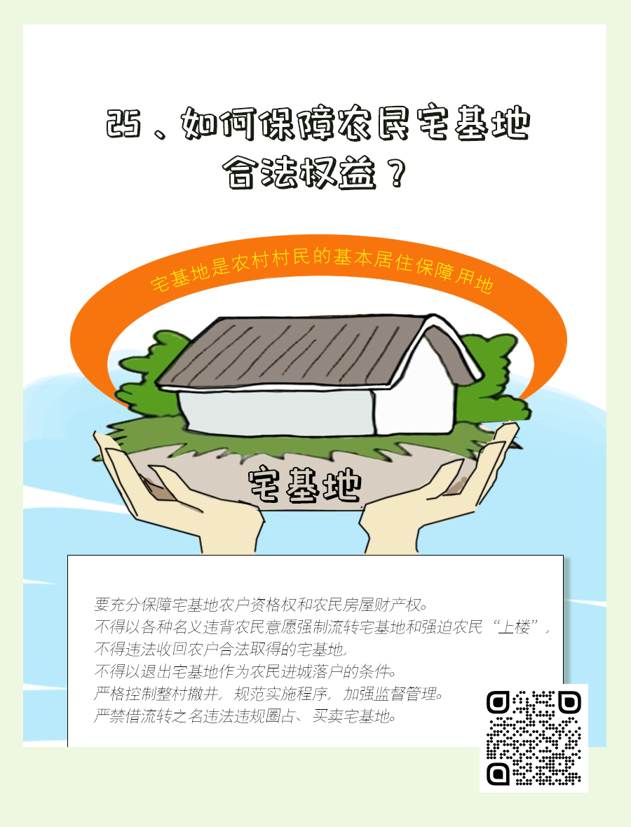 宅基地是农村村民的基本居住保障用地。《中央农村工作领导小组办公室农业农村部关于进一步加强农村宅基地管理的通知》要求:要充分保障宅基地农户资格权和农民房屋财产权。不得以各种名义违背农民意愿强制流转宅基地和强迫农民“上楼”,不得违法收回农户合法取得的宅基地,不得以退出宅基地作为农民进城落户的条件。严格控制整村撤并,规范实施程序,加强监督管理。严禁借流转之名违法违规圈占、买卖宅基地。