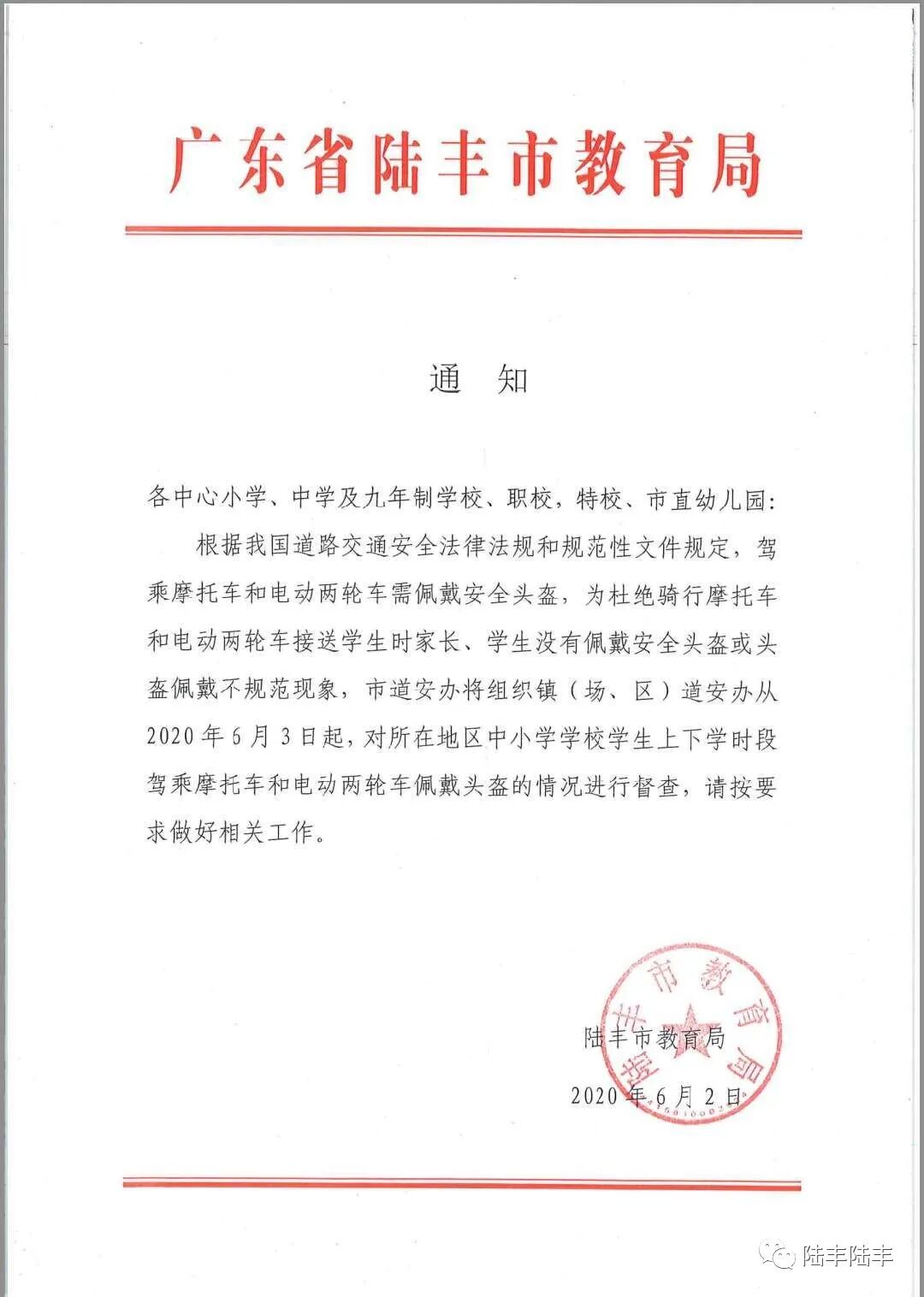 根据我囯道路交通安全法律法规和规范性文件规定,驾乘摩托车和电动两轮车需佩戴安全头盔,为杜绝骑行摩托车和电动两轮车接送学生时家长、学生没有佩戴安全头盔或头盔佩戴不规范现象,市道安办将组织镇(场、区)道安办从2020年6月3日起,对所在地区中小学学校学生上下学时段驾乘摩托车和电动两轮车佩戴头盔的情况进行督查,请按要求做好相关工作。