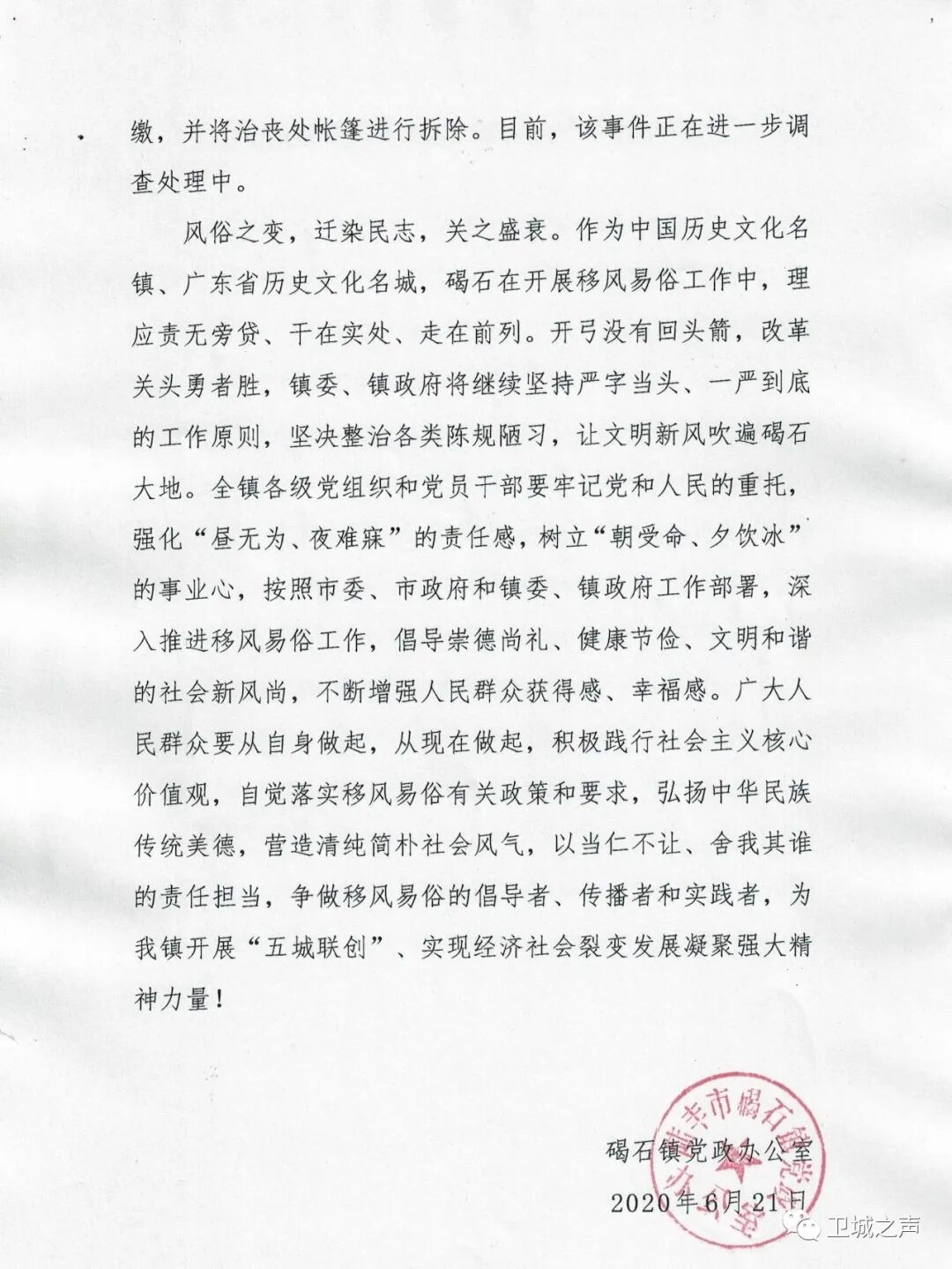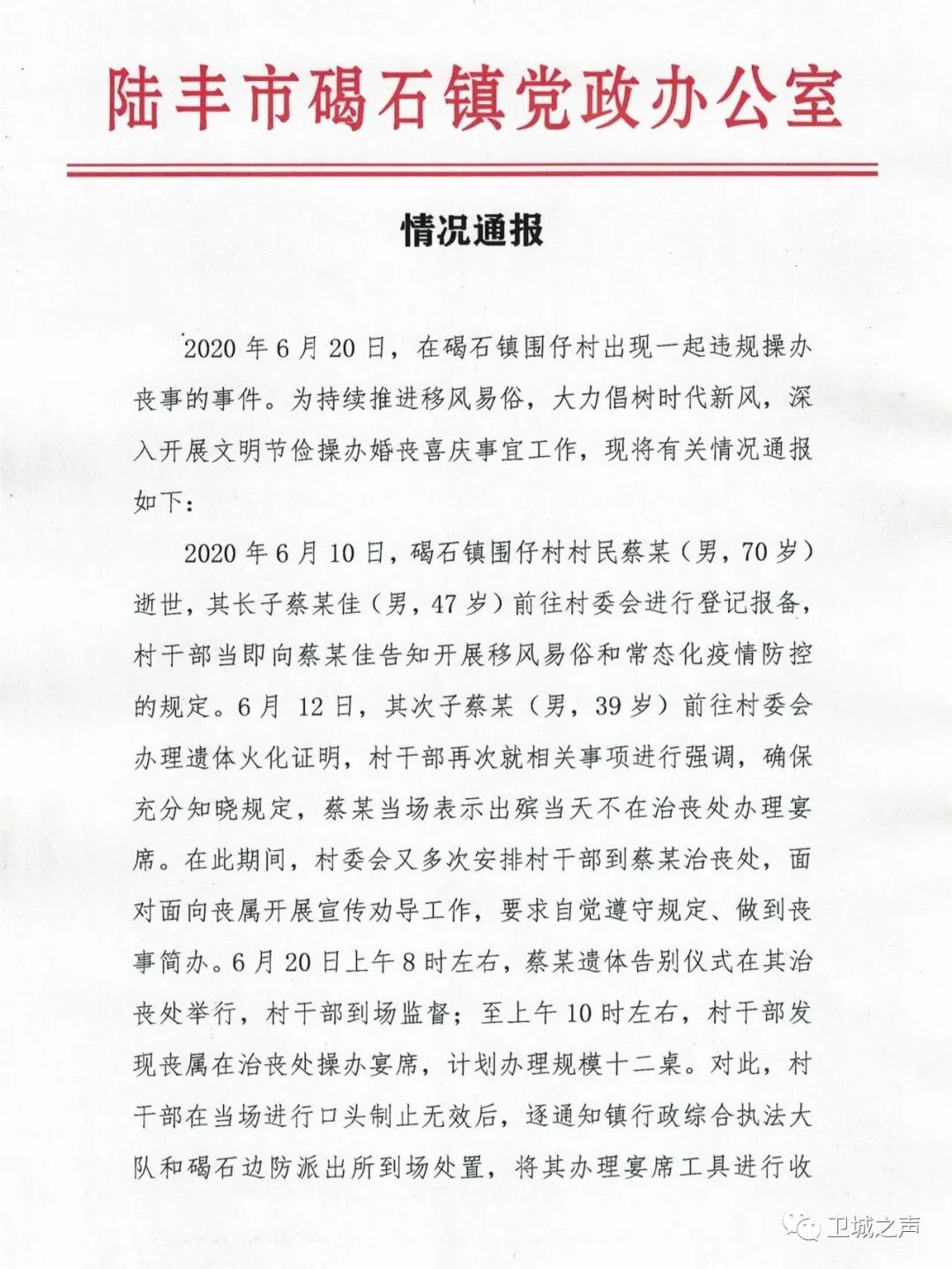 2020年6月20日,在碣石镇围仔村出现一起违规操办丧事的事件。为持续推进移风易俗,大力倡树时代新风,深入开展文明节俭操办婚丧喜庆事宜工作,现将有关情况通报如下:2020年6月10日,碣石镇围仔村村民蔡某(男,70岁)逝世,其长子蔡某佳(男,47岁)前往村委会进行登记报备,村干部当即向蔡某佳告知开展移风易俗和常态化疫情防控的规定。6月 12日,其次子蔡某(男,39岁)前往村委会办理遗体火化证明,村干部再次就相关事项进行强调,确保充分知晓规定,蔡某当场表示出殡当天不在治丧处办理宴席。在此期间,村委会又多次安排村干部到蔡某治丧处,面对面向丧属开展宣传劝导工作,要求自觉遵守规定、做到丧事简办。6月20日上午8时左右,蔡某遗体告别仪式在其治丧处举行,村干部到场监督;至上午10时左右,村干部发现丧属在治丧处操办宴席,计划办理规模十二桌。对此,村干部在当场进行口头制止无效后,逐通知镇行政综合执法大队和碣石边防派出所到场处置,将其办理宴席工具进行收缴,并将治丧处帐篷进行拆除。目前,该事件正在进一步调查处理中。风俗之变,迁染民志,关之盛衰。作为中国历史文化名镇、广东省历史文化名城,在开展移风易俗工作中,碣石理应责无旁贷、干在实处、走在前列。开弓没有回头箭,改革关头勇者胜,镇委、镇政府将继续坚持严字当头、一严到底的工作原则,坚决整治各类陈规陋习,让文明新风吹遍碣石大地。全镇各级党组织和党员干部要牢记党和人民的重托,强化“昼无为、夜难寐”的责任感,树立“朝受命、夕饮冰”的事业心,按照市委、市政府和镇委、镇政府工作部署,深入推进移风易俗工作,倡导崇德尚礼、健康节俭、文明和谐的社会新风尚,不断增强人民群众获得感、幸福感。广大人民群众要从自身做起,从现在做起,积极践行社会主义核心价值观,自觉落实移风易俗有关政策和要求,弘扬中华民族传统美德,营造清纯简朴社会风气,以当仁不让、舍我其谁的责任担当,争做移风易俗的倡导者、传播者和实践者,为我镇开展“五城联创”、实现经济社会裂变发展凝聚强大精神力量!