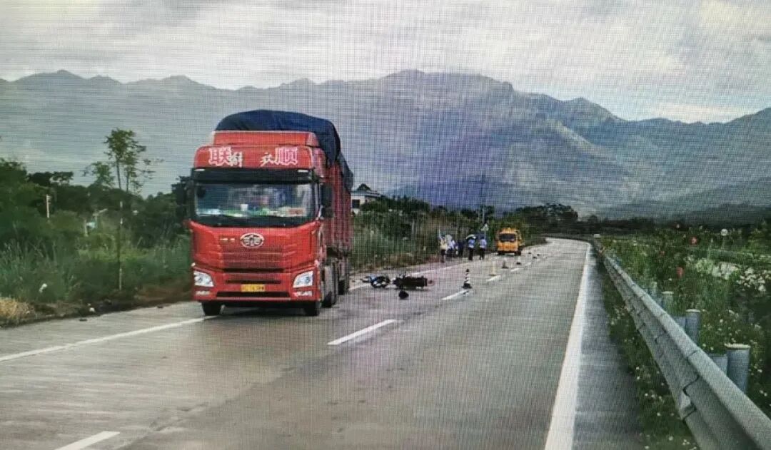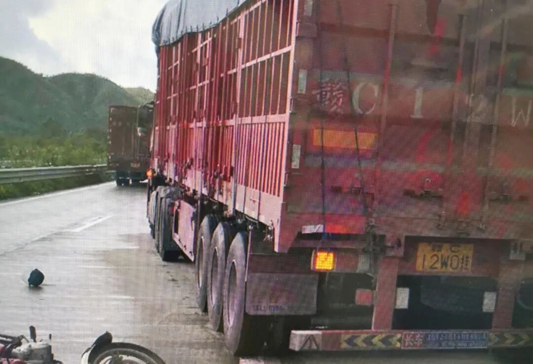 2020年06月05日07时35分,唐某军驾驶悬挂汕尾(临)xxxxx号牌二轮摩托车沿甬莞高速海丰西出口连接线(324国道717KM 900M)自西往东方向行驶,途经莲花山生态谷路口路段时,车辆变更车道过程中与同向由杨某国驾驶的赣Cxxxx号重型半挂牵引车牵引赣Cxxxx挂号重型仓栅式半挂车发生碰撞,造成唐某军当场死亡、车辆损坏的交通事故。![]()