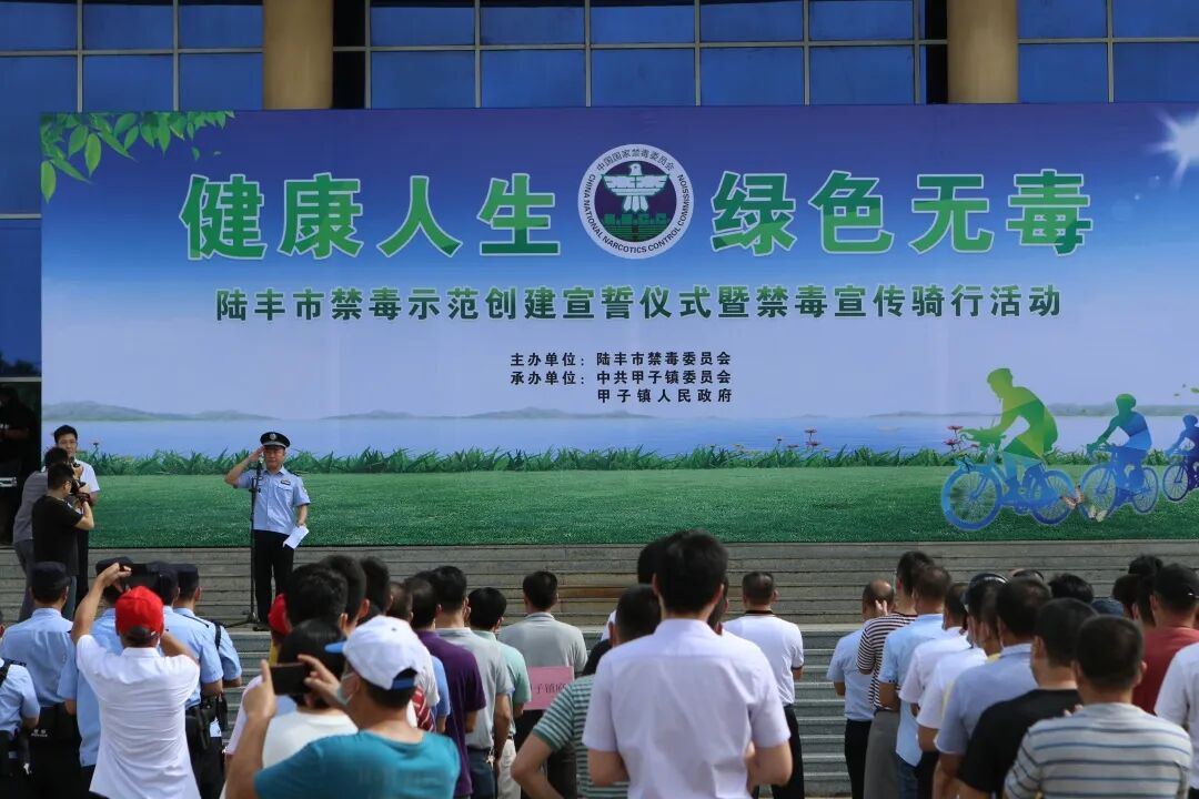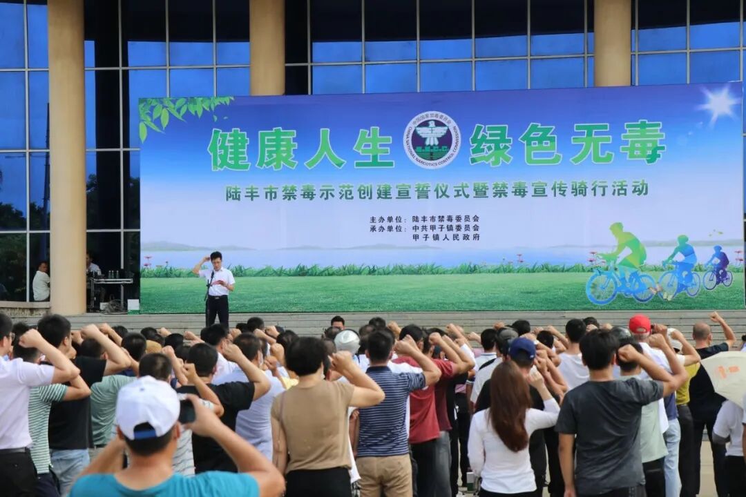 为广泛发动社会各界力量参与,动员人民群众参与禁毒斗争,不断增强广大人民群众特别是青少年拒毒防毒意识,2020年6月26日,值此第33个国际禁毒日到来之际,陆丰市禁毒委以“健康人生,绿色无毒”为主题,在甲子镇政府组织举行陆丰市禁毒示范创建宣誓仪式暨禁毒宣传骑行活动。陆丰市委常委、政法委书记陈武钢,陆丰市副市长、公安局局长、禁毒办主任林奕志出席活动并讲话。