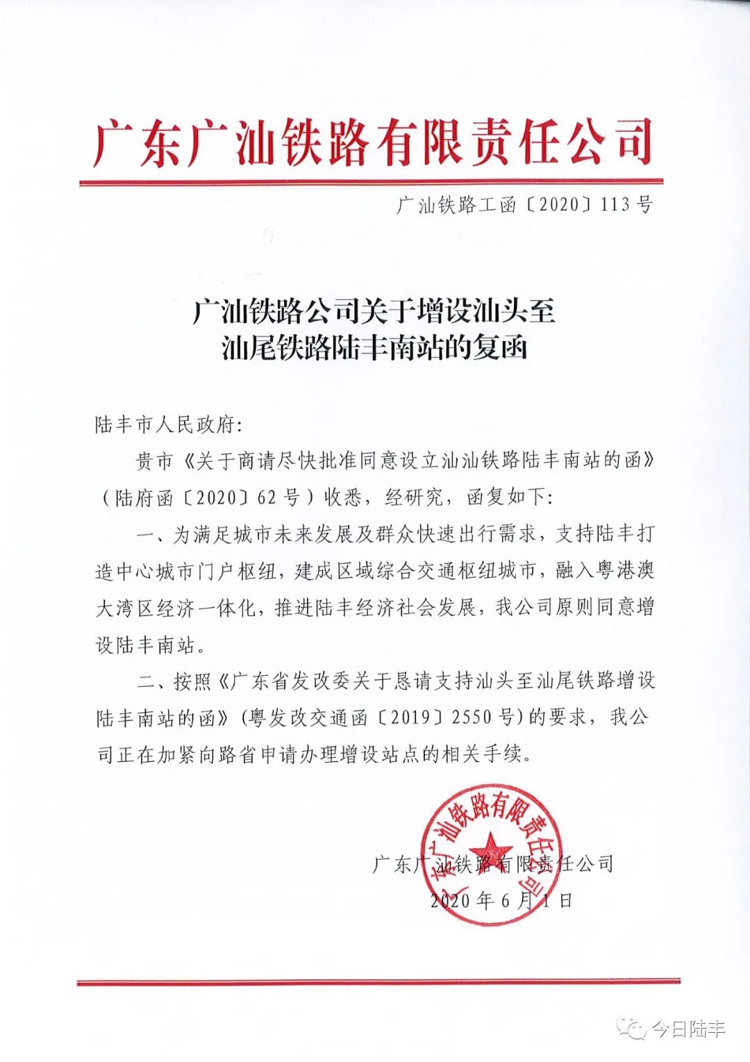 二、按照《广东省发改委关于恳请支持汕头至汕尾铁路增设陆丰南站的函》(粵发改交通函[2019] 2550号)的要求,我公司正在加紧向路省申请办理增设站点的相关手续。