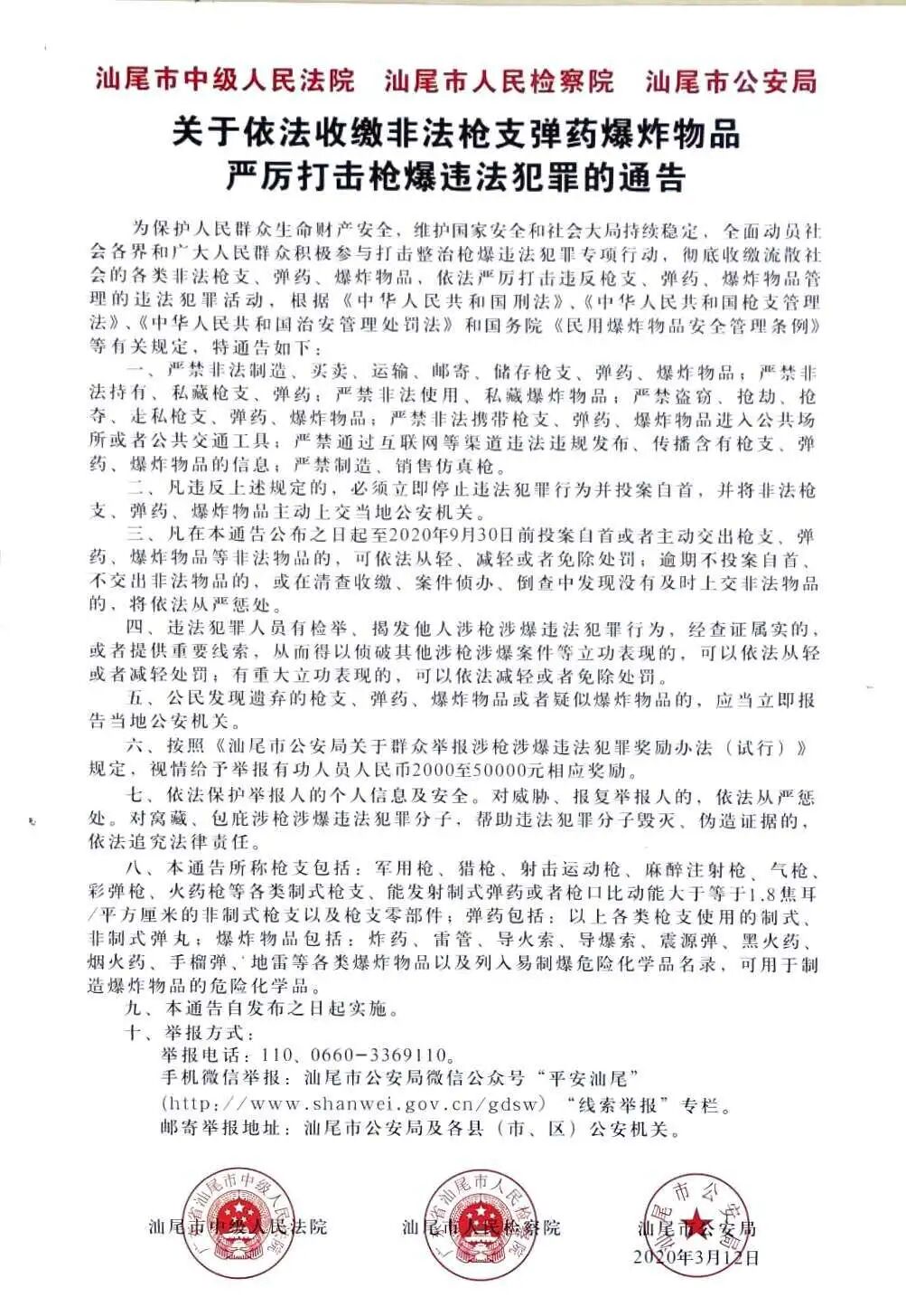 六、按照《汕尾市公安局关于群众举报涉枪涉爆违法犯罪奖励办法(试行)》规定,视情给予举报有功人员人民币2000至50000元相应奖励。