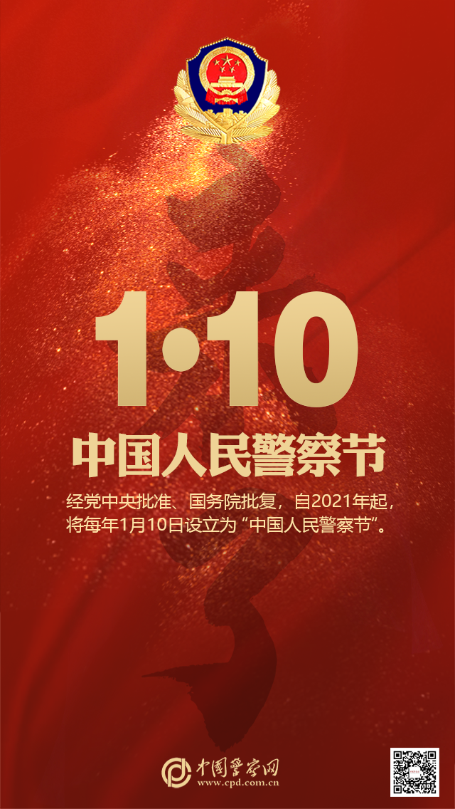 近日,经党中央批准、国务院批复,自2021年起,将每年1月10日设立为“中国人民警察节”。“中国人民警察节”的设立,充分体现了以习近平同志为核心的党中央对人民警察队伍的高度重视和关心关怀,是进一步健全完善人民警察荣誉制度和标志体系的重要举措,对于推动人民警察队伍革命化正规化专业化职业化建设,增强广大民警职业荣誉感自豪感归属感,激励全警以强烈的担当精神履行好党和人民赋予的新时代使命任务具有重大意义。