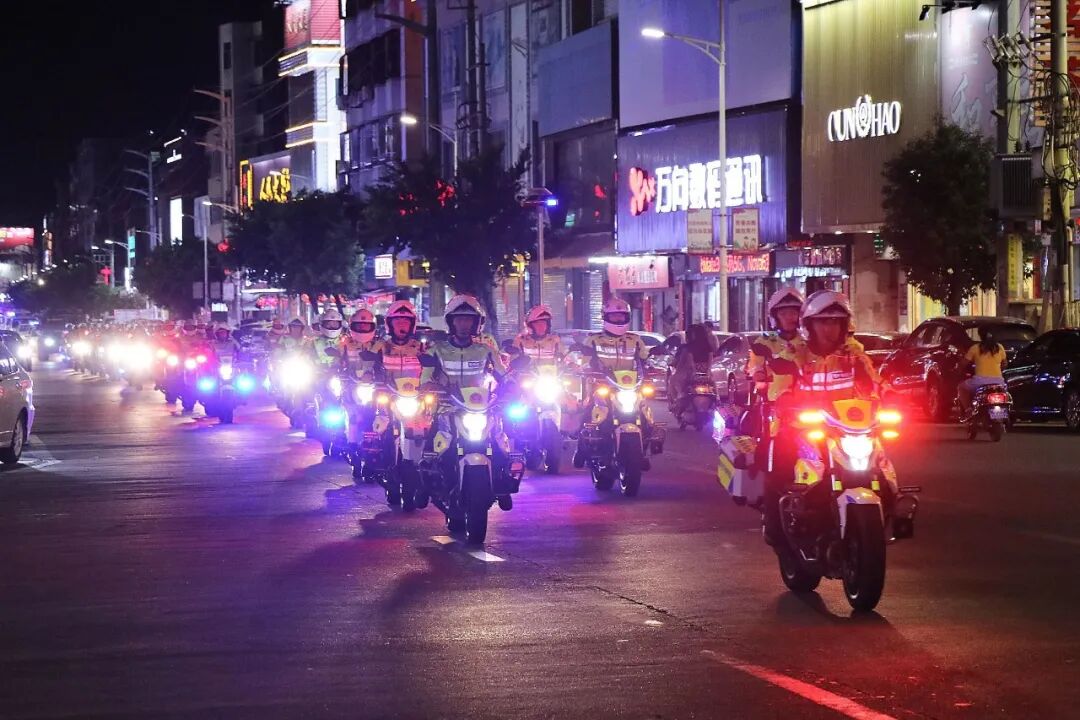 伴随着陈德忠书记的一声令下,警灯闪烁照亮夜空,巡游警车警笛响彻不停。由警用铁骑、警用摩托车、警车、特警防爆车组成的巡游车队从市公安局出发,沿着四十米大道、桥西大道、金钗桥、环城路、金碣路、马街、大街、南堤路、龙山桥、北堤路、人民路、建设路的路线进行巡游,全方位展示陆丰公安各警种良好的精神风貌。