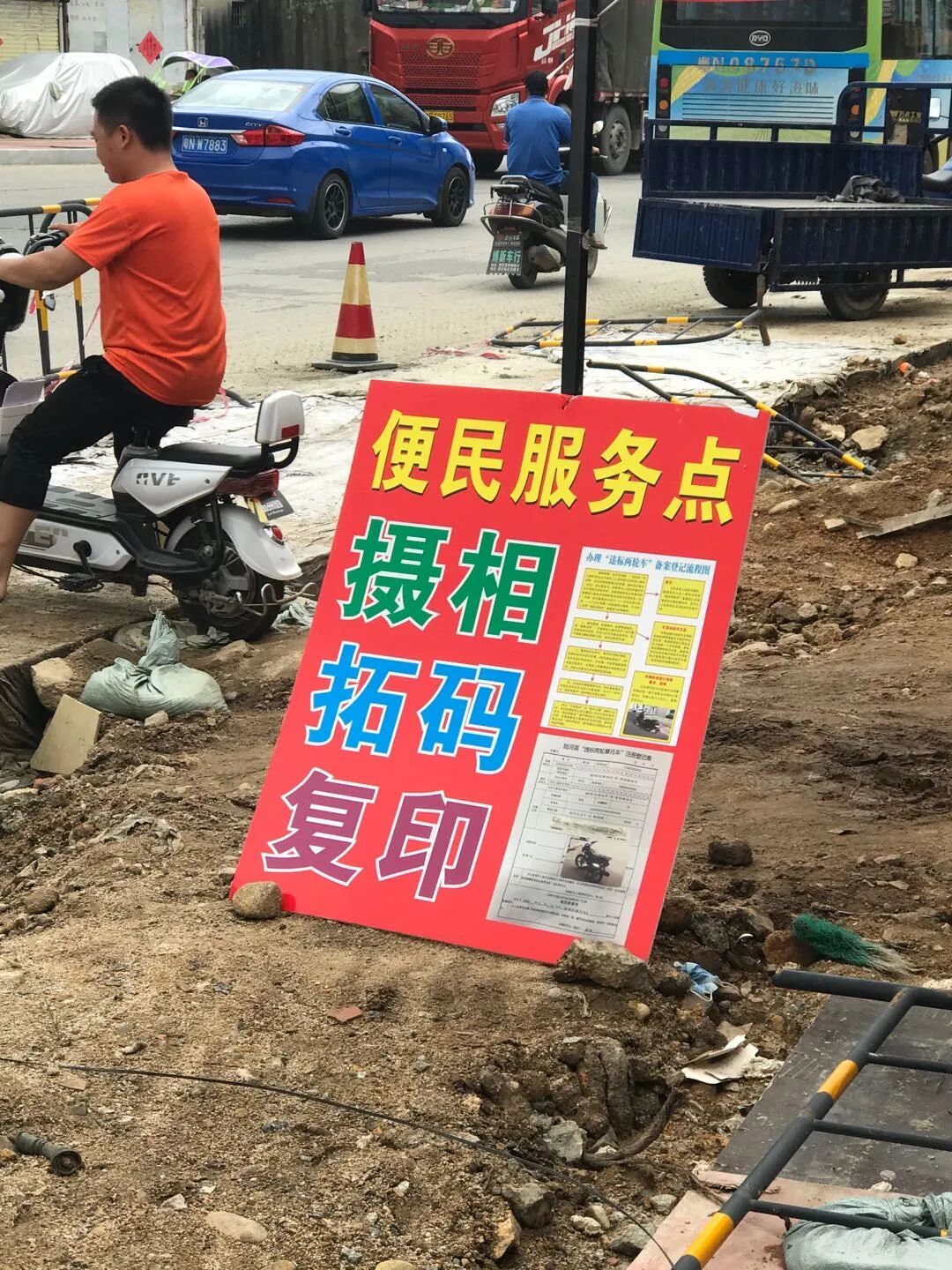 车主本人携带前期已办理的备案登记表等相关资料和身份证件连同车辆到服务点申办“违标两轮车”临时牌证。